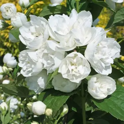 Основное достоинство чубушника — это цветение. Оно начинается в июне и продолжается до середины июля, охватывая 3–4 недели стабильной декоративности. Цветки густомахровые, диаметром до 5 см, снежно-белые, многолепестковые, собраны в соцветия по 5–7 штук. Каждый бутон раскрывается постепенно, создавая эффект непрерывной волны цветения. Аромат насыщенный, стойкий, с характерными жасминовыми нотами, но без навязчивости — он легко ощущается на расстоянии, особенно в утренние и вечерние часы.