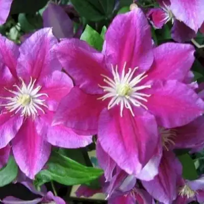 Цветки у клематиса Хания крупные, обычно 12-16 см в поперечнике, с 6 чашелистиками, но бывает и 7. Чашелистики широкоовальной формы, с волнистым краем и заостренным светлым кончиком. Длина чашелистиков - около 7 см, ширина - около 3,5 см, средняя линия с тремя бороздками хорошо заметно. Окраска чашелистика по краю розово-сиренево-красная или сиреневато-розовая, в центре пурпурно-красная. У весенних цветков розовый край шире, у поздних - уже. Тычиночные нити белые, пыльники золотистые.