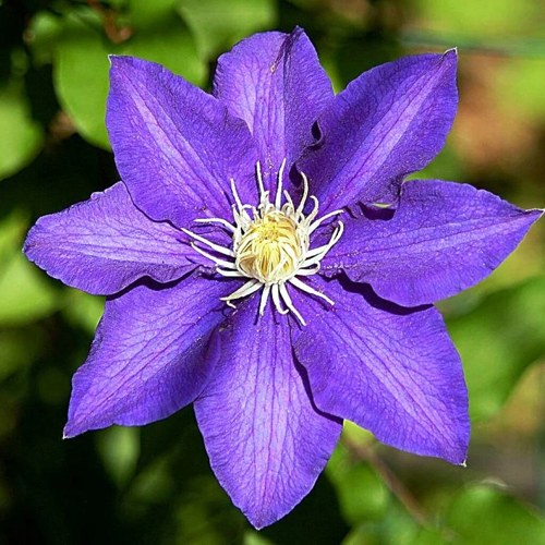 Главное украшение сорта — крупные цветки диаметром 15–20 см. Они раскрываются двумя волнами: в конце весны и повторно в конце лета, а насыщенный сине-фиолетовый оттенок с серебристым обратным свечением и бордовыми тычинками делает посадку эффектной и запоминающейся. Цветение длительное, выразительное и превращает любую опору в живую декоративную конструкцию.