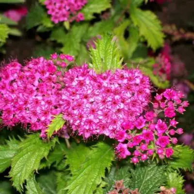 Спирея Криспа цветёт с июля до сентября, радуя пышными розово-лиловыми соцветиями, напоминающими зонтики. Размер этих соцветий может достигать 5-6 см, а сами цветы — небольшие, с легким ароматом, который создаёт атмосферу лёгкости и свежести в вашем саду.