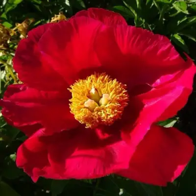 Цветение "Америки" – это настоящее зрелище. Его крупные цветы имеют диаметр свыше 20 см и обладают насыщенным ало-красным оттенком, который просто притягивает взгляд. Леапестки имеют чашевидную форму, гофрированную структуру и расширяются к краям, что придает цветкам выразительность. Ярко-желтые тычинки собраны в плотный помпон, а желто-зеленый пестик с белым рыльцем дополнительно добавляет эстетического очарования, а его края окрашены в бледно-розовый цвет. Аромат пиона "Америка" еле уловимый.