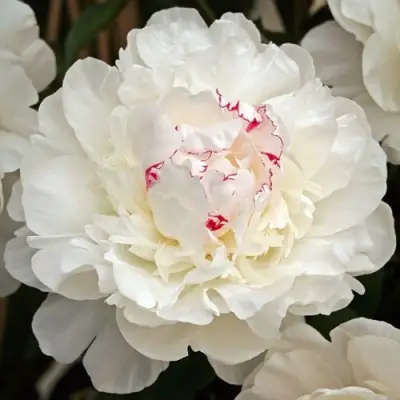 Цветки пиона Фестива Максима — это истинное наслаждение для глаз. Они относятся к махровым, розовидным сортам и обладают крупными размерами, достигая в диаметре 16-25 см. Основная окраска белая, с изящными красными мазками на центральных лепестках, а также тонкой фиолетовой каймой, что придает дополнительную привлекательность. Цветы тяжелые и плотные, с вогнутыми лепестками, структура которых настолько нежная, что кажется, будто они сделаны из самой шелковой материи. Аромат пиона приятен и стойкий, что делает его идеальным не только для сада, но и для флористических композиций, ведь срезанные цветы сохраняют свою свежесть долгое время.