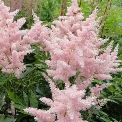 Астильба Европа характеризуется густыми вертикально растущими метелками крупных соцветий, которые достигают высоты 10-15 см и диаметра 20-25 см. Цветки мелкие, окрашенные в нежный розовый цвет с легким ароматом, создают обильные и эффектные цветочные композиции, радуя глаз с июня по август. Продолжительность цветения составляет 20-25 дней.
