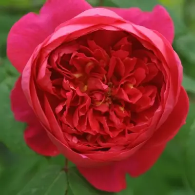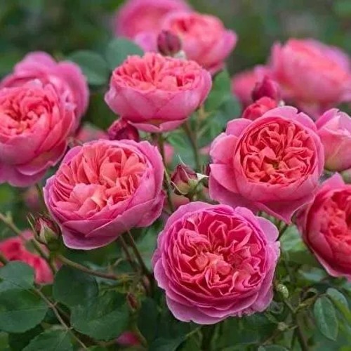 Главное достоинство сорта — редкий цветок сложного кораллово-малинового оттенка. В распуске бутон демонстрирует насыщенный красно-оранжевый тон с переходами в винно-розовую гамму. Цветки крупные, 8–10 см в диаметре, густомахровые, чашевидной формы, собраны в небольшие кисти по 3–5 штук. Цветение — волнами с июня по октябрь, с быстрым восстановлением бутонов после срезки. Аромат стойкий, глубокий: слива, груша, малина, вино — и всё это в одном цветке.